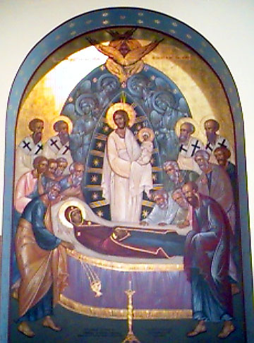 According to a very early Christian legend, while the apostles were scattered all over the then-known world, preaching the Gospel, Mary remained in Jerusalem in the house of John. Her love of God, like an ardent flame, burned steadily in her body. Finally it was revealed to her that her life was about to end, she wished to see the Twelve once more before she died. Each one of them was miraculously carried away from where he happened to be and borne on a cloud to the house on Mount Sion in Jerusalem where Mary was approaching death: each one of them, that is, except Thomas. They saw Christ Himself come down from heaven and receive the soul of his Mother in his arms. They took her holy body and placed it in the tomb prepared for it in the valley of Cedron, near Gethsemani. Thomas arrived three days later, when all was over. He wished to see for the last time the face of the woman who had been the Temple of God. He went with the other apostles to the tomb, which they opened: they found it empty, but heard an angelic concert. Mary herself appeared to them and confirmed the fact of her Assumption into heaven.DATE COMPLETED: 1982
